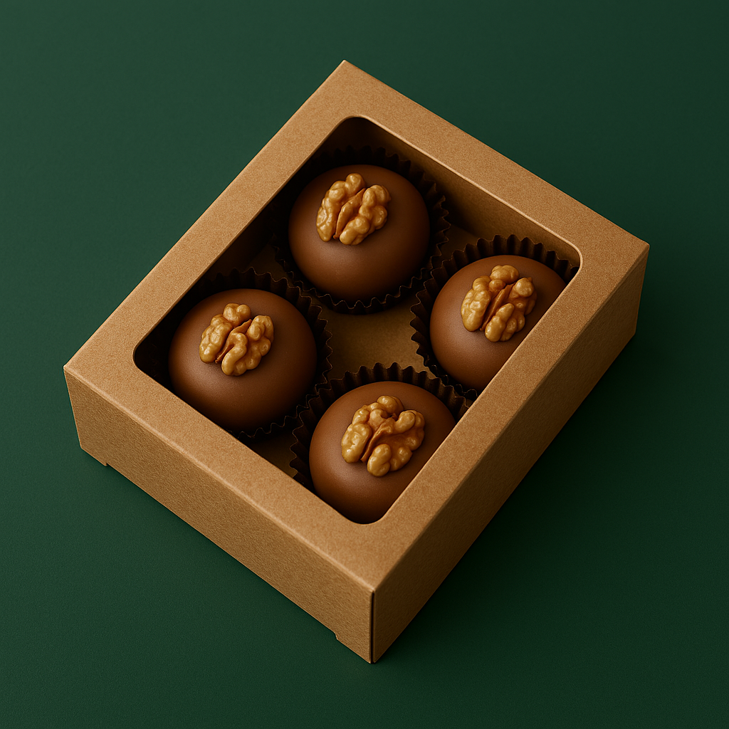 Embalagem em papel kraft, ideal para sobremesas retangulares. Tampa com visor transparente, montagem prática e acabamento premium que valoriza o produto artesanal.