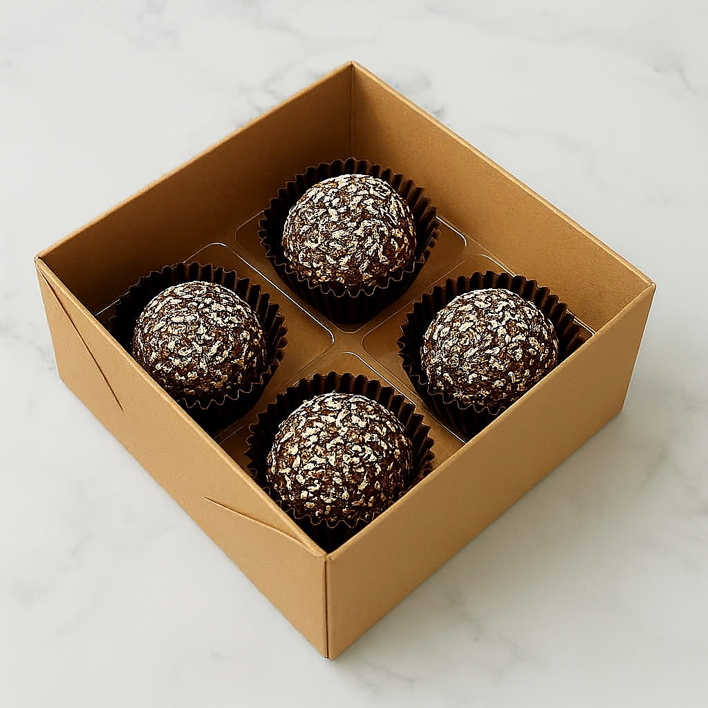 Embalagem em papel kraft, ideal para 4 doces gourmet. Tampa total em acetato, montagem prática e acabamento premium que valoriza o produto artesanal.